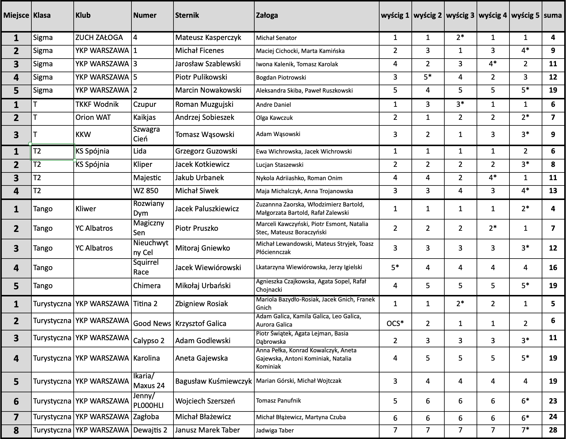 Wyniki regat – Puchar Klubu Sailing Legia