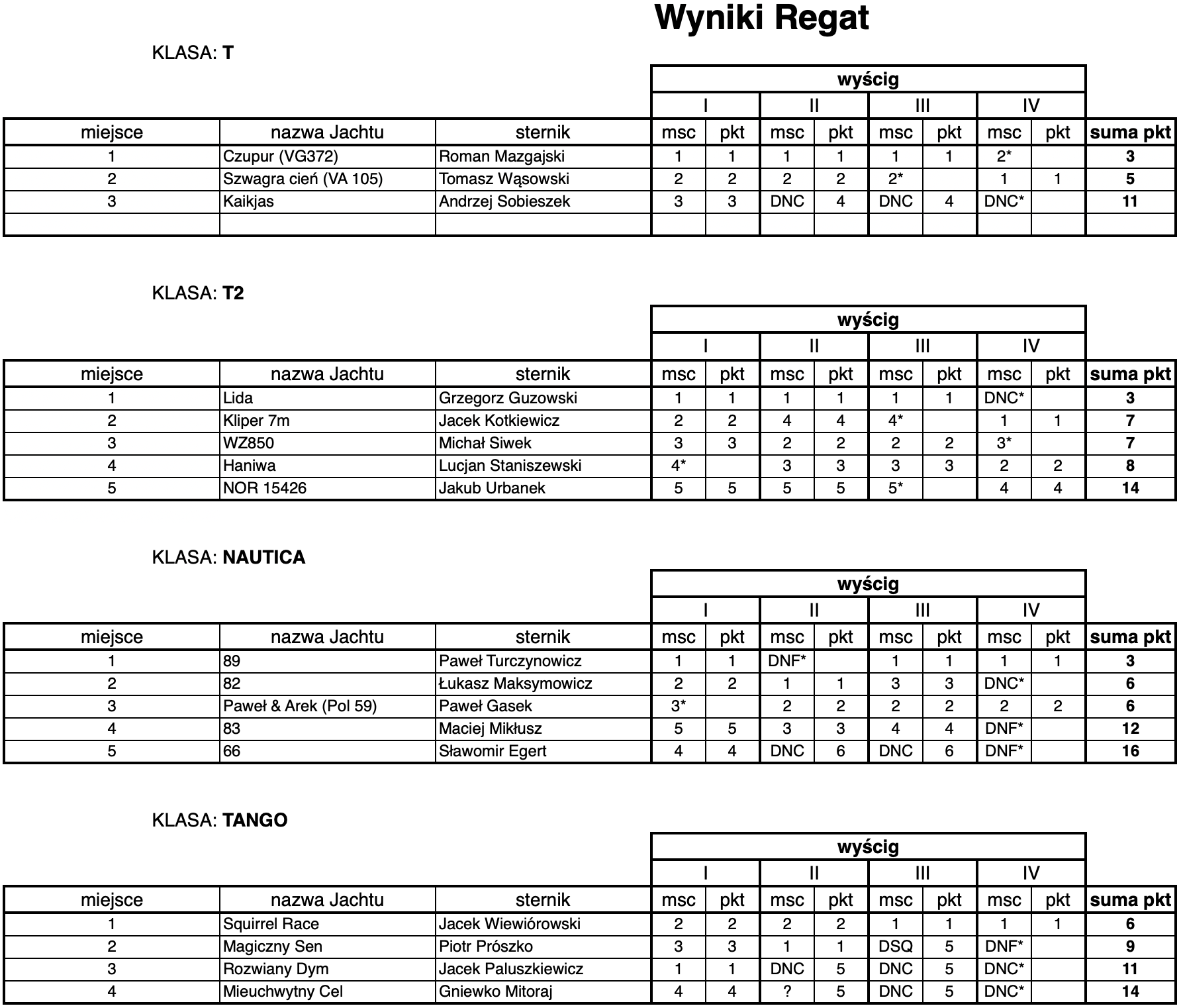 Wyniki Regat o Puchar Spójni Warszawa (70-lecie US Spójnia)